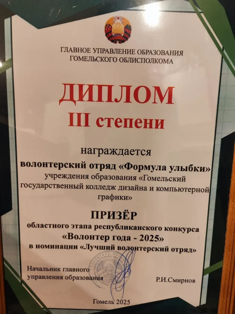 22 января состоялся областной этап республиканского конкурса «Волонтёр года -2025 «. Отряд «Формула улыбки» колледжа принял участие в номинации «Лучший волонтерский отряд» и награждён Дипломом третьей степени. Волонтеры отряда представили свою программу работы в социальной сфере и показали театрализованное представление. Особая благодарность девушкам объединений по интересам «Переходный возраст» и «Голос», а также педагогам дополнительного образования Захаренко О.А. и Килякову С.М. за красивые хореографические и вокальные номера. Волонтеры отряда — это обучающиеся групп 12, 21, 22, 1 ОТ, 33, 1Д, 1ДПИ, 2 ДПИ.