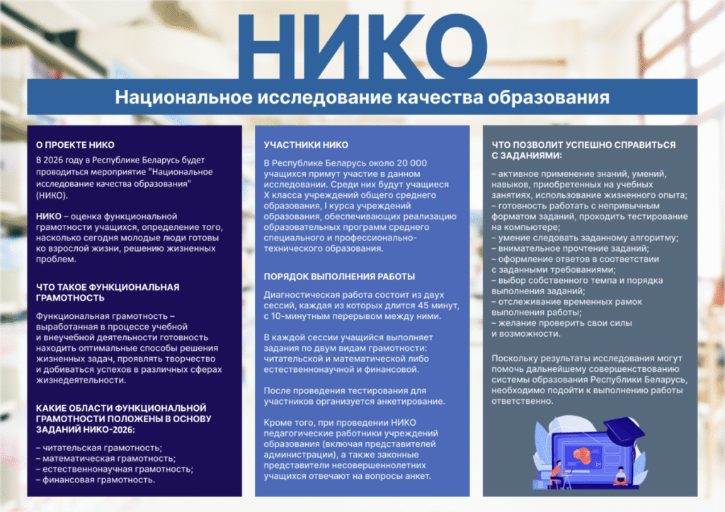 В ноябре-декабре 2025 года в нашей стране планируется проведение репетиционного этапа национального исследования качества образования (НИКО). Основной этап исследования будет проводиться в первом полугодии 2026/2027 учебного года.