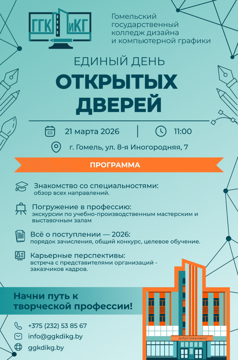21 марта 2026 в 11.00 приглашаем учащихся школ и их родителей на ЕДИНЫЙ ДЕНЬ ОТКРЫТЫХ ДВЕРЕЙ! В программе мероприятия: общее собрание, экскурсии по выставочным залам и учебно-производственным мастерским колледжа.