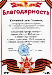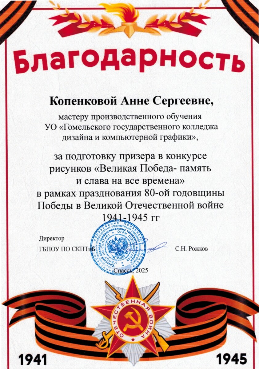 Благодарность. Копенковой Анне Сергеевне, мастеру производственного обучения УО «Гомельского государственного колледжа дизайна и компьютерной графики», за подготовку призера в конкурсе рисунков «Великая Победа-память и слава на все времена» в рамках празднования 80-ой годовщины Победы в Великой Отечественной войне 1941-1945 гг |