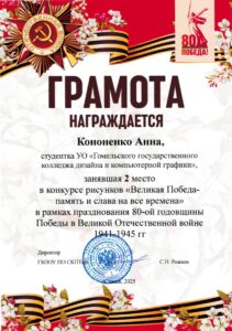 Грамота. Награждается Кононенко Анна, студентка УО «Гомельского государственного колледжа дизайна и компьютерной графики», занявшая 2 место в конкурсе рисунков «Великая Победа-память и слава на все времена» в рамках празднования 80-ой годовщины Победы в Великой Отечественной войне 1941-1945 гг |