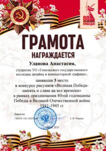 Грамота. Награждается Уланова Анастасия, студентка УО «Гомельского государственного колледжа дизайна и компьютерной графики», занявшая 3 место в конкурсе рисунков «Великая Победа-память и слава на все времена» в рамках празднования 80-ой годовщины Победы в Великой Отечественной войне 1941-1945 гг |