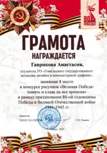 Грамота. Награждается Гаврикова Анастасия, студентка УО «Гомельского государственного колледжа дизайна и компьютерной графики», занявшая 1 место в конкурсе рисунков «Великая Победа-память и слава на все времена» в рамках празднования 80-ой годовщины Победы в Великой Отечественной войне 1941-1945 гг |
