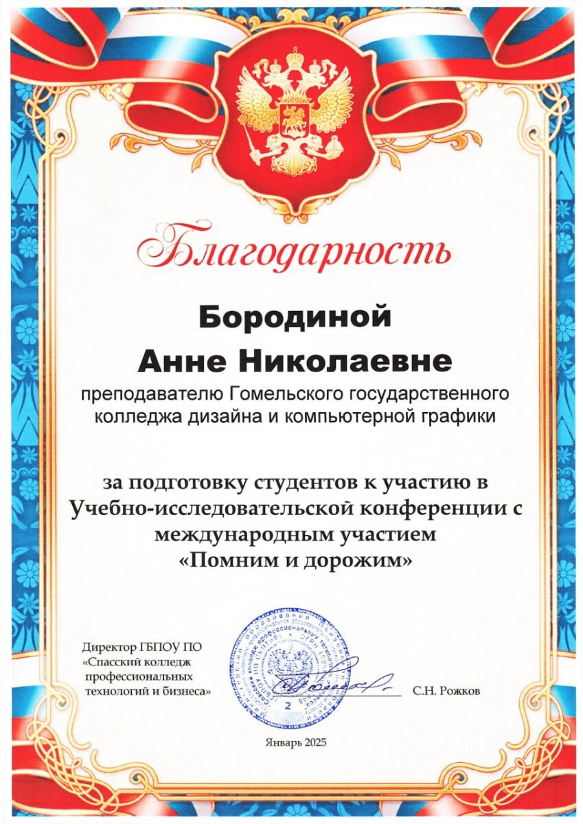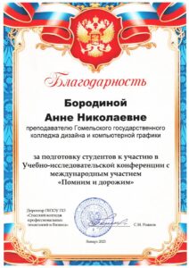 Благодарность. Награждается Бородиной Анне Николаевне — преподавателю Гомельского государственного колледжа дизайна и компьютерной графики за подготовку студентов к участию в Учебно-исследовательской конференции с международным участием «Помним и дорожим» |
