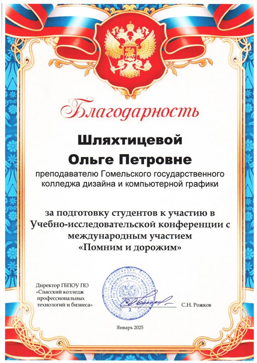 Благодарность. Награждается Шляхтицевой Ольге Петровне — преподавателю Гомельского государственного колледжа дизайна и компьютерной графики за подготовку студентов к участию в Учебно-исследовательской конференции с международным участием «Помним и дорожим» |