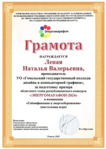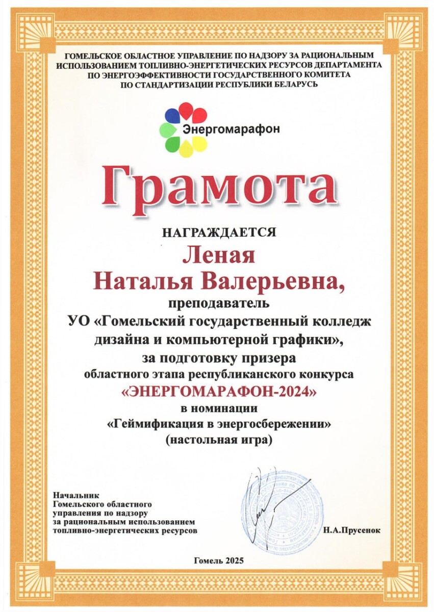 Грамота. Награждается Леная Наталья Валерьевна, преподаватель УО «Гомельский государственный колледж дизайна и компьютерной графики», за подготовку призера областного этапа республиканского конкурса «ЭНЕРГОМАРА ФОН-2024» в номинации «Геймификация в энергосбережении» (настольная игра) |