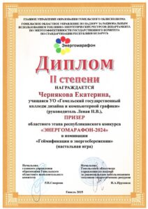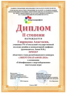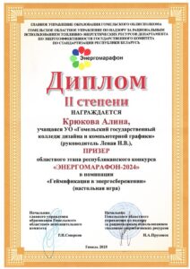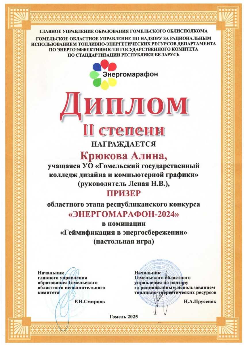 Диплом II степени. Награждается Крюкова Алина, учащаяся УО «Гомельский государственный колледж дизайна и компьютерной графики» (руководитель Леная Н.В.), ПРИЗЕР областного этапа республиканского конкурса «ЭНЕРГОМАРАФОН-2024» в номинации «Геймификация в энергосбережении»(настольная игра) |