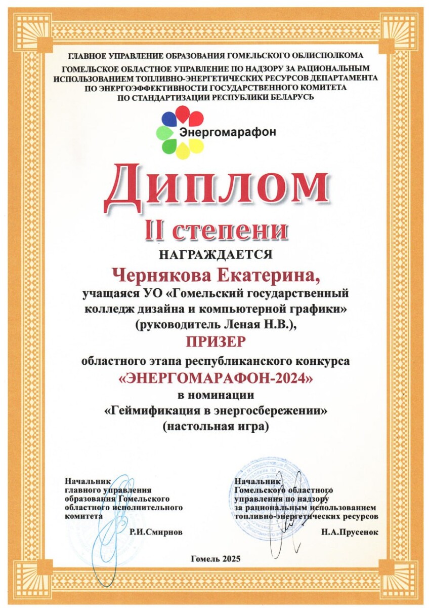 Диплом II степени. Награждается Чернякова Екатерина, учащаяся УО «Гомельский государственный колледж дизайна и компьютерной графики» (руководитель Леная Н.В.), ПРИЗЕР областного этапа республиканского конкурса «ЭНЕРГОМАРАФОН-2024» в номинации «Геймификация в энергосбережении»(настольная игра) |
