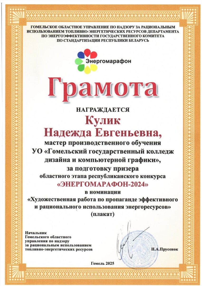 Грамота. Награждается Кулик Надежда Евгеньевна, мастер производственного обучения УО «Гомельский государственный колледж дизайна и компьютерной графики», за подготовку призера областного этапа республиканского конкурса «ЭНЕРГОМАРА ФОН-2024» в номинации «Художественная работа по пропаганде эффективного и рационального использования энергоресурсов» (плакат) |