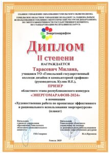 Диплом II степени. Награждается Тарасевич Милана, учащаяся УО «Гомельский государственный колледж дизайна и компьютерной графики» (руководитель Кулик Н.E.), ПРИЗЕР областного этапа республиканского конкурса «ЭНЕРГОМАРАФОН-2024» в номинации «Художественная работа по пропаганде эффективного и рационального использования энергоресурсов» (плакат) |