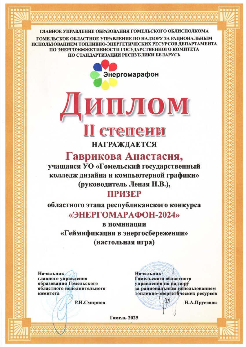 Диплом II степени. Награждается Гаврикова Анастасия, учащаяся УО «Гомельский государственный колледж дизайна и компьютерной графики» (руководитель Леная Н.В.), ПРИЗЕР областного этапа республиканского конкурса «ЭНЕРГОМАРАФОН-2024» в номинации «Геймификация в энергосбережении»(настольная игра) |