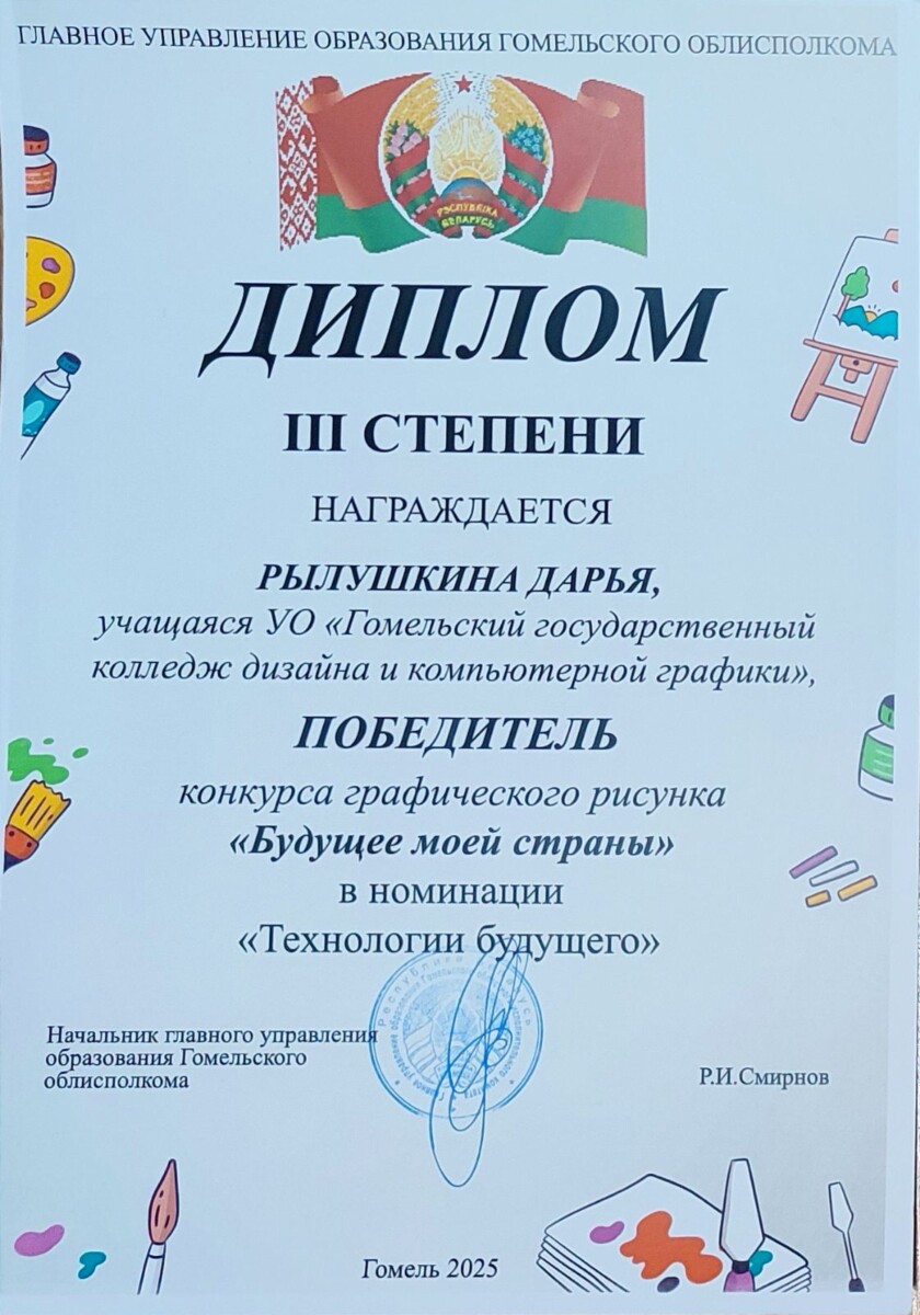 Диплом ІІ степени. Награждается РЫЛУШКИНА ДАРЬЯ, учащаяся УО «Гомельский государственный колледж дизайна и компьютерной графики», ПОБЕДИТЕЛЬ конкурса графического рисунка «Будущее моей страны» в номинации «Технологии будущего» |
