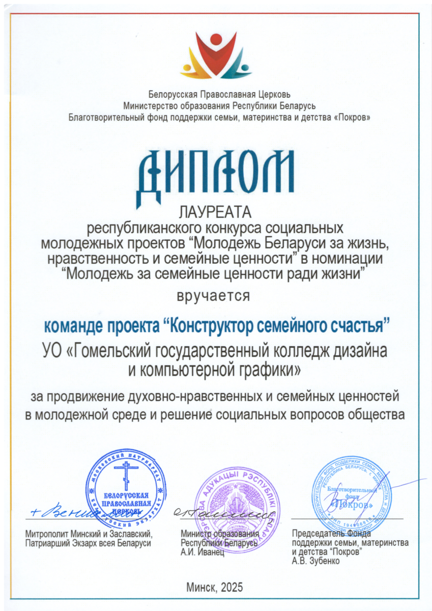 Диплом Лауреата. Республиканского конкурса социальных молодежных проектов «Молодежь Беларуси за жизнь, нравственность и семейные ценности» в номинации «Молодежь за семейные ценности ради жизни» вручается команде проекта «Конструктор семейного счастья» УО «Гомельский государственный колледж дизайна и компьютерной графики» за продвижение духовно-нравственных и семейных ценностей в молодежной среде и решение социальных вопросов общества |