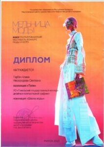 ДИПЛОМ. Награждается Горбач Алина Нескородова Светлана коллекция «Топи» УО «Гомельский государственный колледж дизайна и компьютерной графики» номинация «Школа моды» |