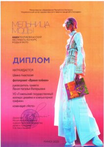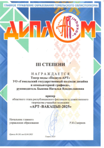 Диплом ІІІ степени. Награждается театр моды «Подиум-АРТ» призер областного этапа республиканского фестиваля художественного творчества учащейся молодежи «АРТ-ВАКАЦЫI-2025». Руководитель Быкова Наталья Владиславовна (Учреждение образования «Гомельский государственный колледж дизайна и компьютерной графики») |