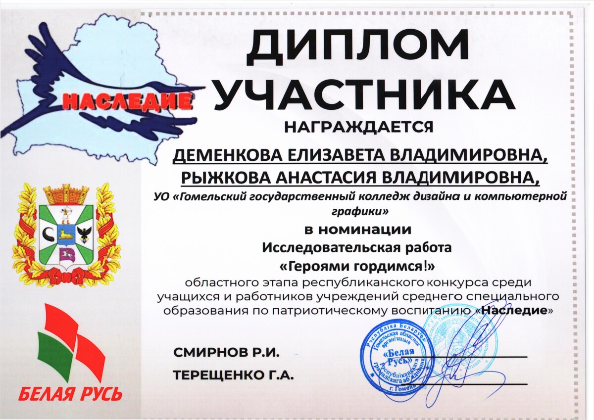 ДИПЛОМ НАГРАЖДАЕТСЯ ДЕМЕНКОВА ЕЛИЗАВЕТА ВЛАДИМИРОВНА, РЫЖКОВА АНАСТАСИЯ ВЛАДИМИРОВНА, УО «Гомельский государственный колледж дизайна и компьютерной графики» в номинации Исследовательская работа «Героями гордимся!» областного этапа республиканского конкурса среди учащихся и работников учреждений среднего специального образования по патриотическому воспитанию «Наследие» |