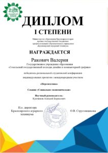Диплом І степени. Награждается Ракович Валерия Государственное учреждение образования «Гомельский государственный колледж дизайна и компьютерной графики» победитель региональной студенческой конференции индивидуальных проектов с международным участием «Перспектива» Секция «Социально-экономическая» Научный руководитель: Купчинов Алексей Борисович