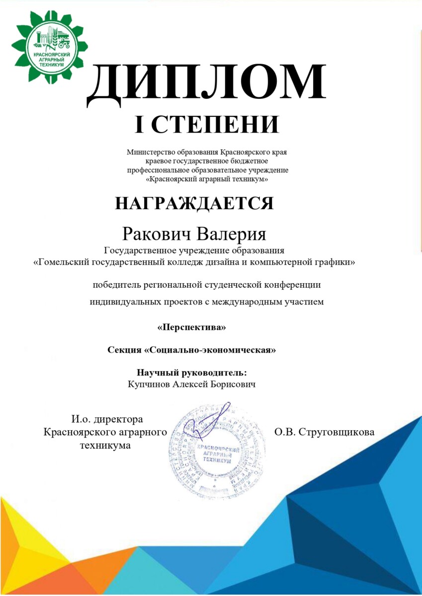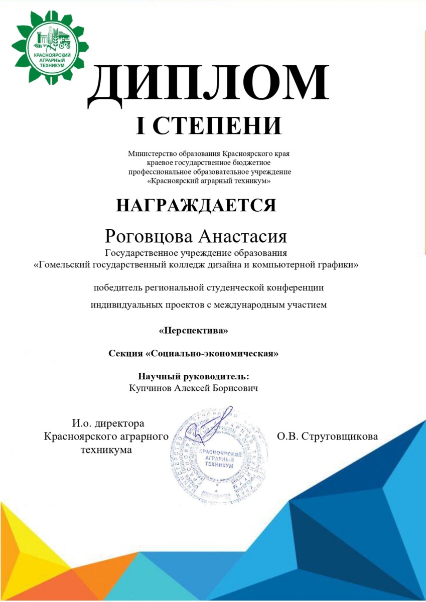 Диплом І степени. Награждается Роговцова Анастасия Государственное учреждение образования «Гомельский государственный колледж дизайна и компьютерной графики» победитель региональной студенческой конференции индивидуальных проектов с международным участием «Перспектива» Секция «Социально-экономическая» Научный руководитель: Купчинов Алексей Борисович |