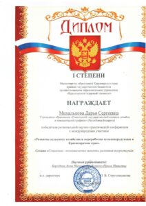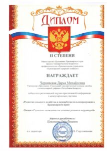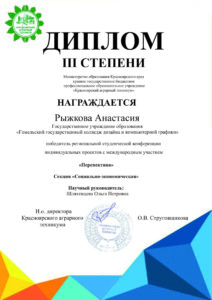 Диплом І степени. Награждается Михальцова Дарья Сергеевна (Учреждение образования «Гомельский государственный колледж дизайна и компьютерной графики» (Республика Беларусь) победителя региональной научно-практической конференции с международным участием «Развитие сельского хозяйства и переработки сельхозпродукции в Красноярском крае». Секция «Социально-экономические аспекты развития территорий». Научные руководители: Бородина Анна Николаевна Величко Ирина Ивановна |