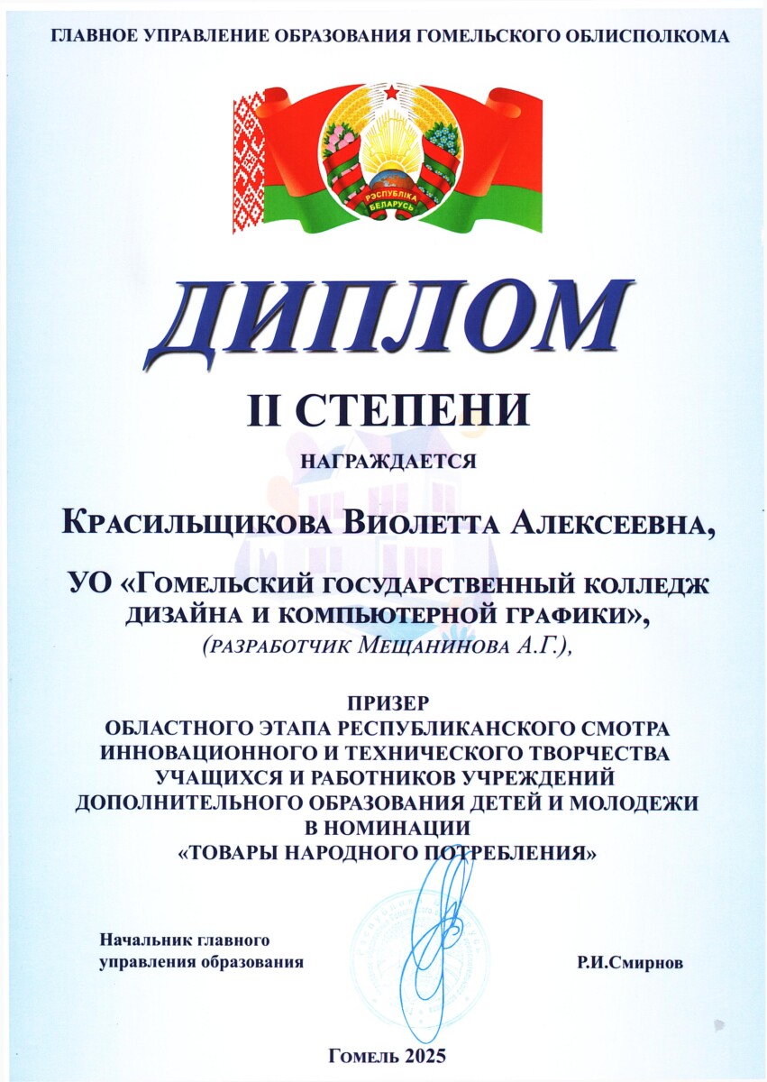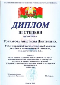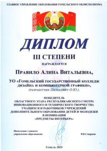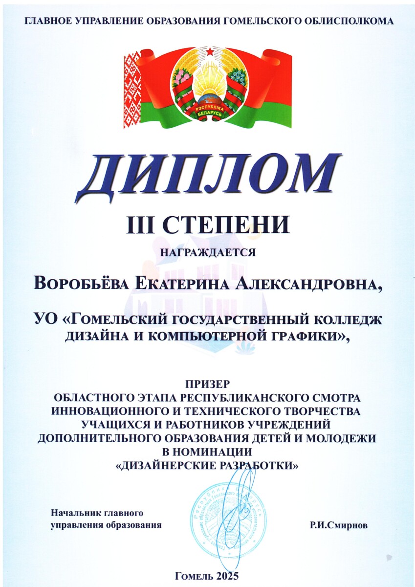Диплом ІІІ степени. Награждается Воробьёва Екатерина Александровна, УО «Гомельский государственный колледж дизайна и компьютерной графики». Призер областного этапа республиканского смотра инновационного и технического творчества учащихся и работников учреждения дополнительного образования детей и молодежи в номинации «Дизайнерские разработки» |