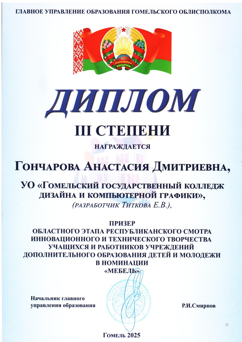 Диплом ІІІ степени. Награждается Гончарова Анастасия Дмитриевна, УО «Гомельский государственный колледж дизайна и компьютерной графики»(Разработчик Титкова Е.В.). Призер областного этапа республиканского смотра инновационного и технического творчества учащихся и работников учреждения дополнительного образования детей и молодежи в номинации «Мебель» |