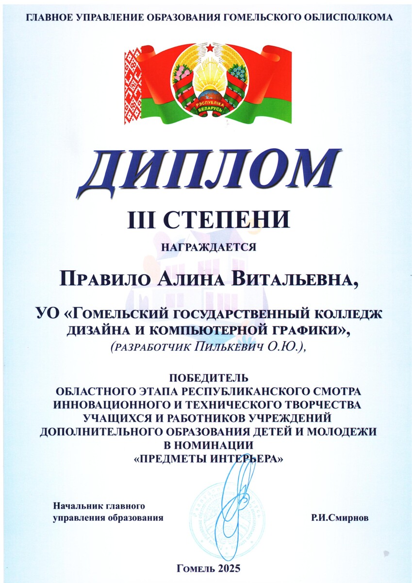 Диплом ІІІ степени. Награждается Правило Алина Витальевна, УО «Гомельский государственный колледж дизайна и компьютерной графики»(Разработчик Пилькевич О.Ю.). Призер областного этапа республиканского смотра инновационного и технического творчества учащихся и работников учреждения дополнительного образования детей и молодежи в номинации «Предметы интерьера» |