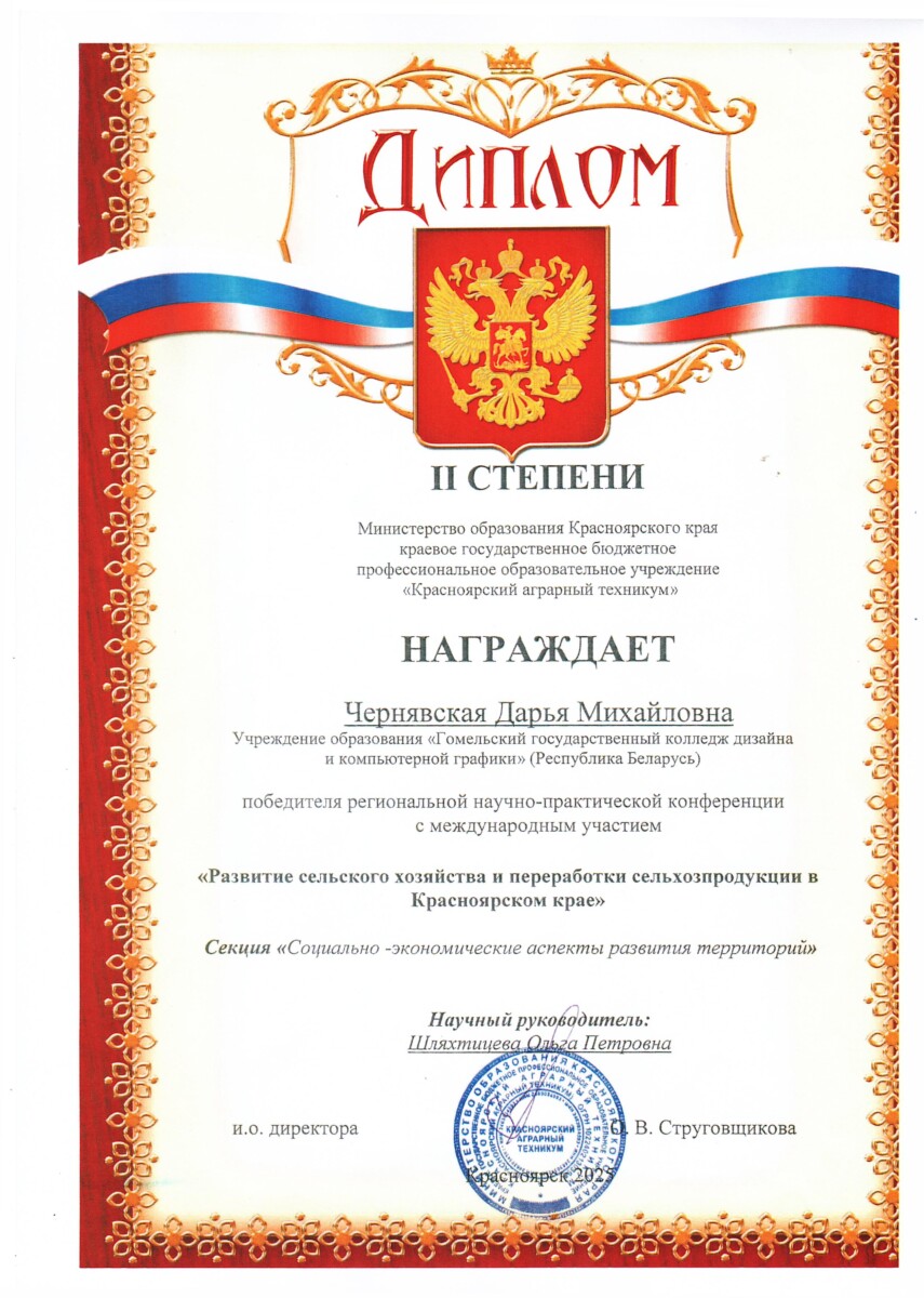Диплом ІІ степени. Награждается Чернявская Дарья Михайловна (Учреждение образования «Гомельский государственный колледж дизайна и компьютерной графики» (Республика Беларусь) победителя региональной научно-практической конференции с международным участием «Развитие сельского хозяйства и переработки сельхозпродукции в Красноярском крае». Секция «Социально-экономические аспекты развития территорий». Научный руководитель: Шляхтицева Ольга Петровна |
