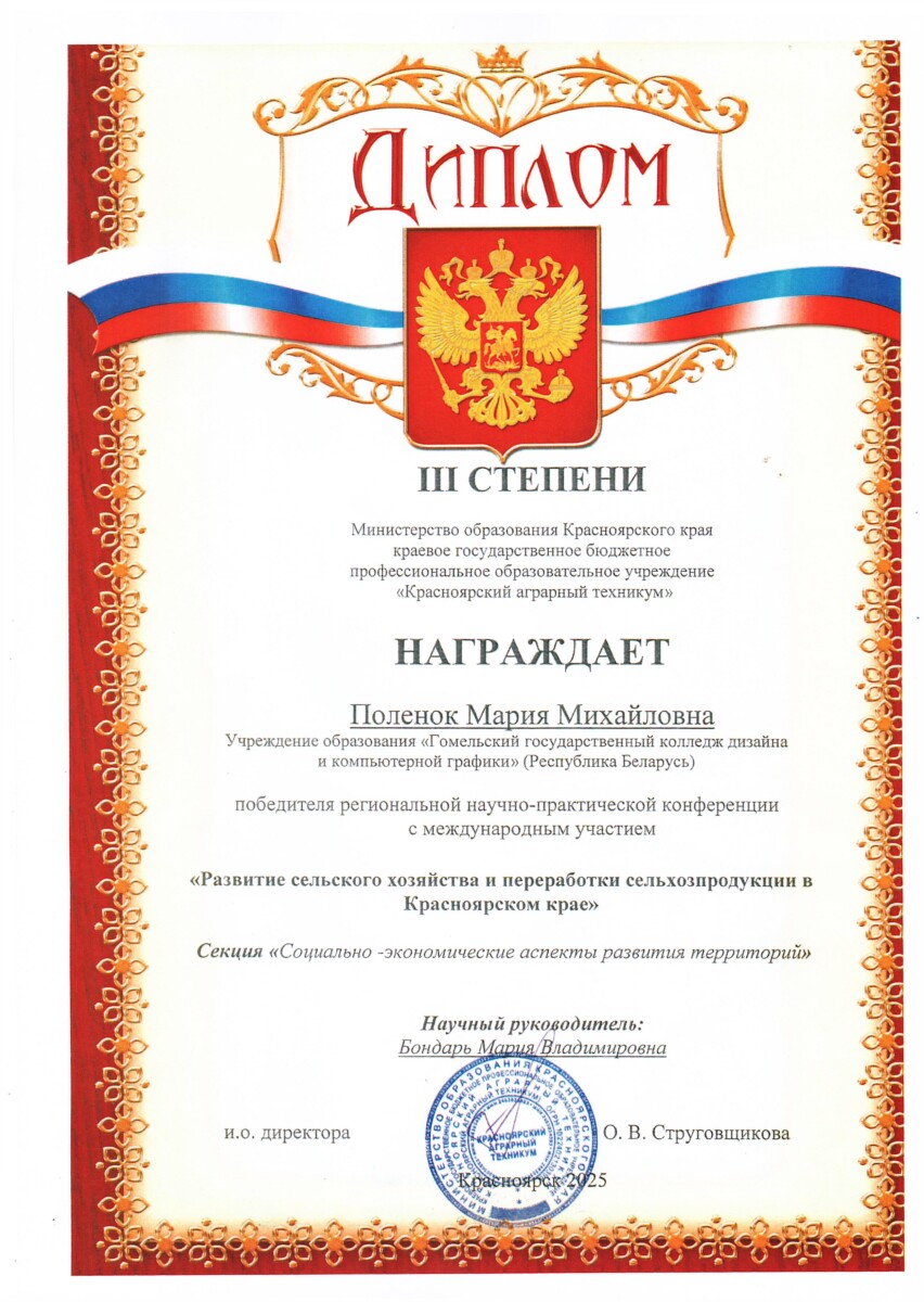 Диплом ІІІ степени. Награждается Поленок Мария Михайловна (Учреждение образования «Гомельский государственный колледж дизайна и компьютерной графики» (Республика Беларусь) победителя региональной научно-практической конференции с международным участием «Развитие сельского хозяйства и переработки сельхозпродукции в Красноярском крае». Секция «Социально-экономические аспекты развития территорий». Научный руководитель: Бондарь Мария Владимировна |