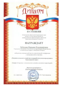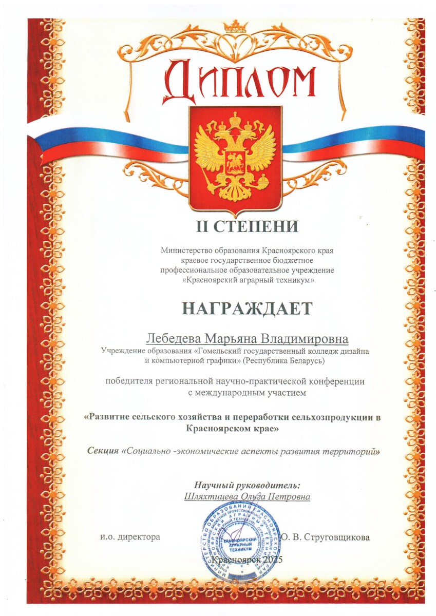 Диплом ІІ степени. Награждается Лебедева Марьяна Владимировна (Учреждение образования «Гомельский государственный колледж дизайна и компьютерной графики» (Республика Беларусь) победителя региональной научно-практической конференции с международным участием «Развитие сельского хозяйства и переработки сельхозпродукции в Красноярском крае». Секция «Социально-экономические аспекты развития территорий». Научный руководитель: Шляхтицева Ольга Петровна |