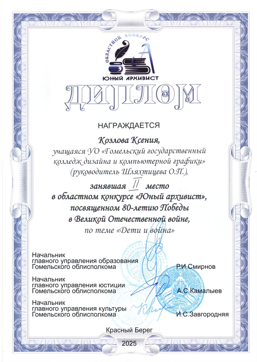 Диплом ІІ степени. Награждается Козлова Ксения, учащаяся УО «Гомельский государственный колледж дизайна и компьютерной графики» (руководитель Шляхтицева О.П.), занявшая ІІ место в областном конкурсе «Юный архивист», посвященном 80-летию Победы в Великой Отечественной войне, по теме «Дети и война» |