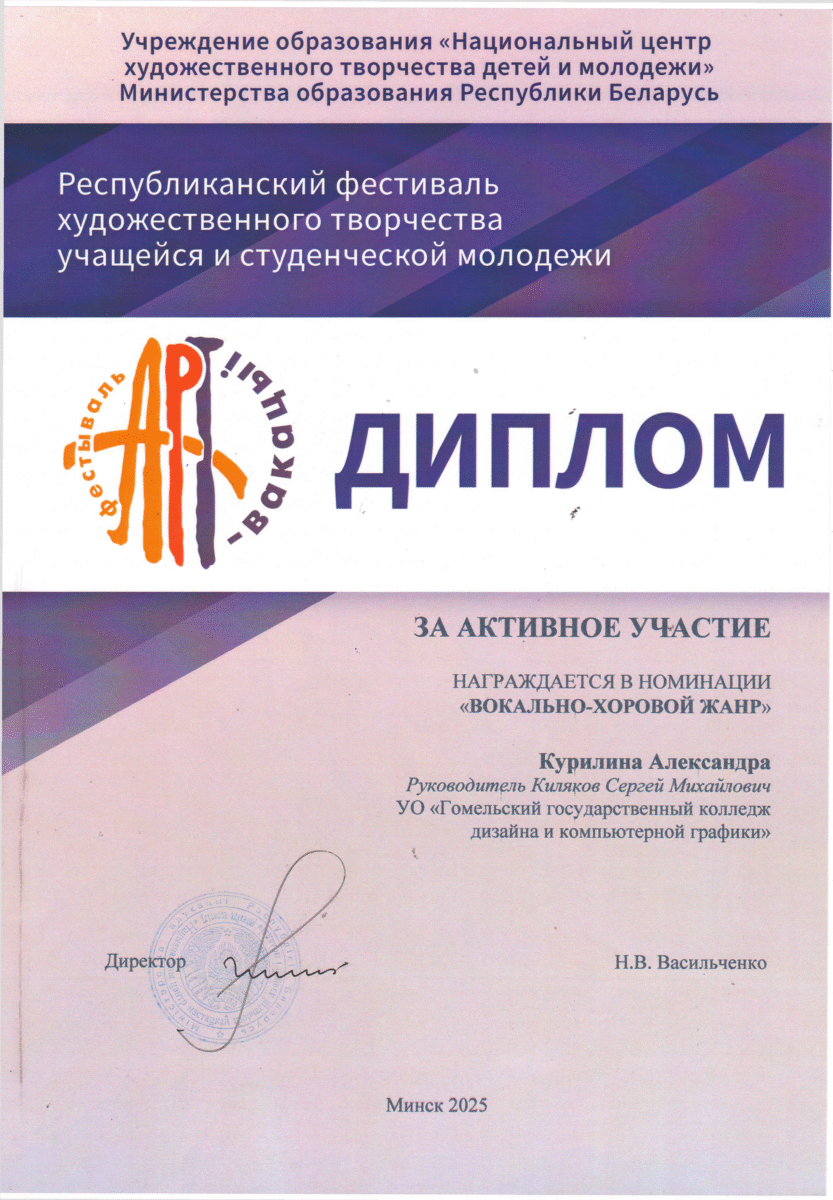 Диплом за активное участие. Награждается Курилина Александра в номинации «Вокально-хоровой жанр». Руководитель Киляков Сергей Михайлович (Учреждение образования «Гомельский государственный колледж дизайна и компьютерной графики») |