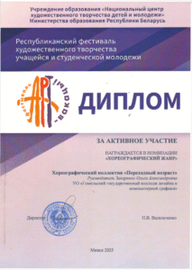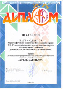 Диплом ІІІ степени. Награждается хореографический коллектив «Переходный возраст» призер областного этапа республиканского фестиваля художественного творчества учащейся молодежи «АРТ-ВАКАЦЫI-2025». Руководитель Захаренко Ольга Александровна (Учреждение образования «Гомельский государственный колледж дизайна и компьютерной графики») |
