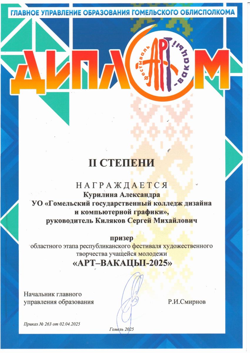 Диплом ІІ степени. Награждается Курилина Александра призер областного этапа республиканского фестиваля художественного творчества учащейся молодежи «АРТ-ВАКАЦЫI-2025». Руководитель Киляков Сергей Михайлович (Учреждение образования «Гомельский государственный колледж дизайна и компьютерной графики») |