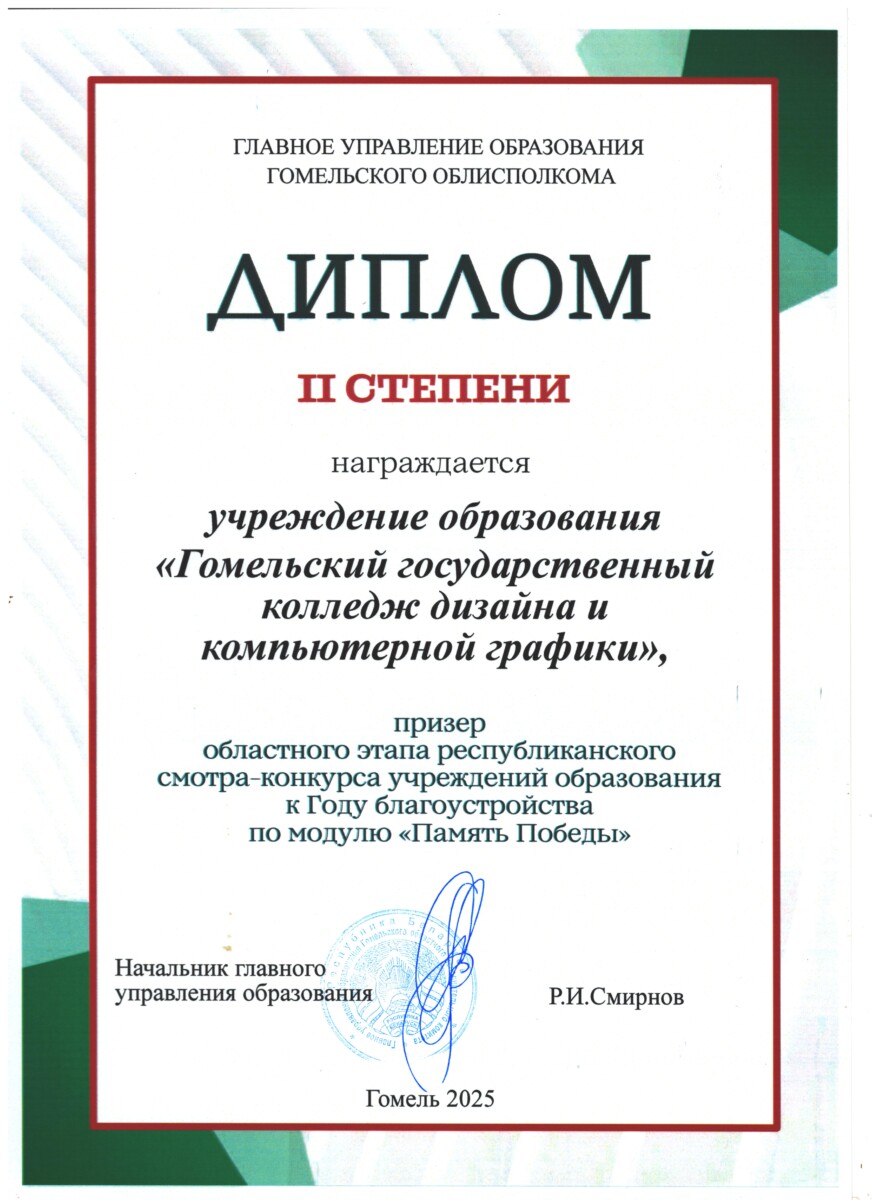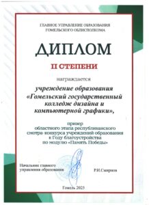 Диплом ІІ степени. Награждается учреждение образования «Гомельский государственный колледж дизайна и компьютерной графики», призер областного этапа республиканского смотра-конкурса учреждений образования к Году благоустройства по модулю «Память Победы» |
