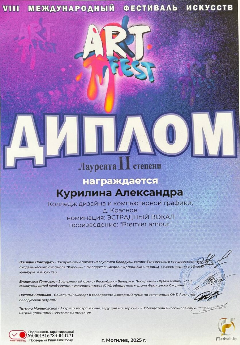 Диплом Лауреата ІІ степени. Награждается Курилина Александра (Учреждение образования «Гомельский государственный колледж дизайна и компьютерной графики»), VIII Международный фестиваль искусств «ART FEST» в номинация «Эстрадный вокал», произведение «Premier amour» |
