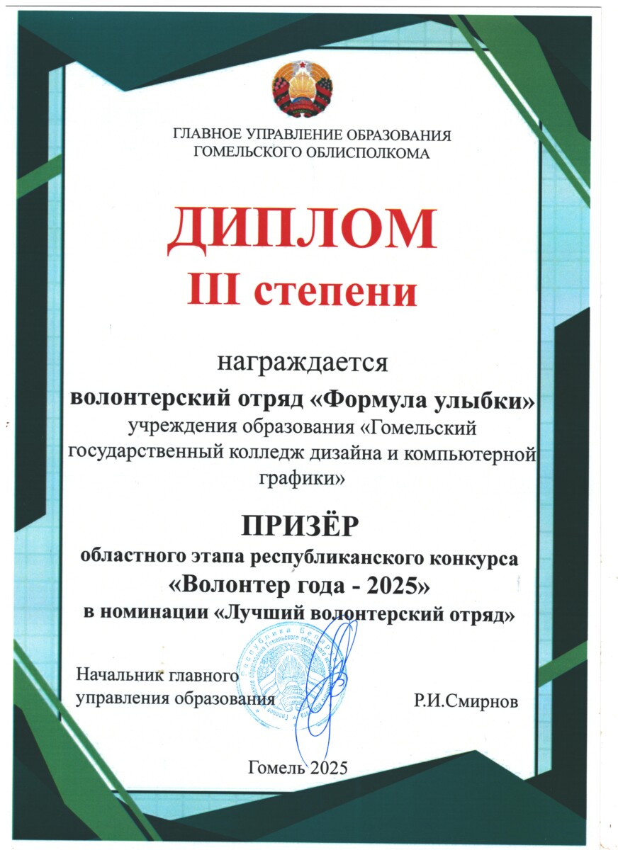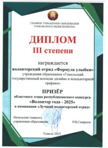 Диплом III степени. Награждается волонтерский отряд «Формула улыбки» учреждения образования «Гомельский государственный колледж дизайна и компьютерной графики», призер областного этапа республиканского конкурса «Волонтер года — 2025» в номинации «Лучший волонтерский отряд» |